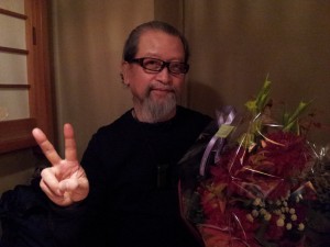 スタッフ一同からお祝いのお花のプレゼントに笑顔の院長。